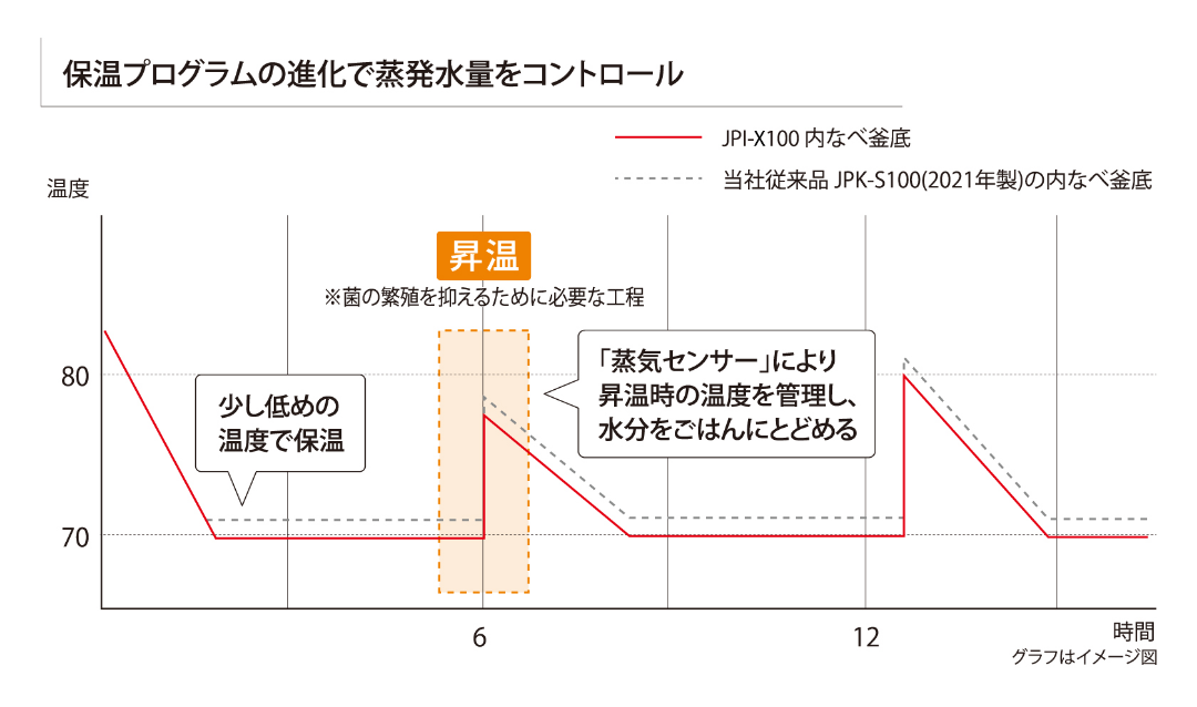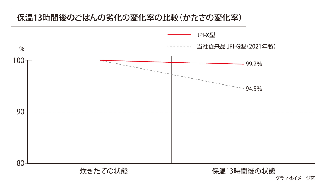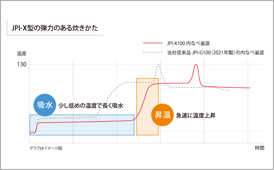 ※JPI-X100と当社従来品JPI-S100(2022年度製)の内なべの比較。なべの底外面の温度 160度の場合(実際の炊飯時の温度を想定)の積分放射率を比較。JPI-X100 83.56% JPI-S100 82.50% (当社調べ)