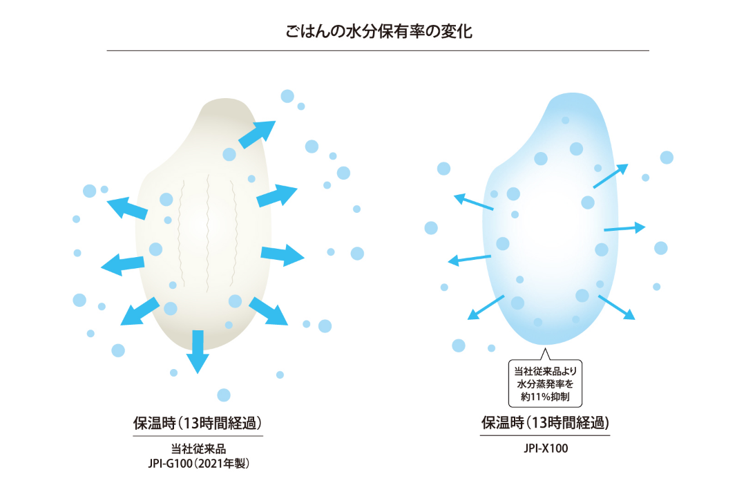 当社従来品と比べ保温13時間後の水分蒸発率を約11%抑えることに成功※。炊飯後時間が経過してもみずみずしさを保ち、ごはんのパサつきをおさえます。