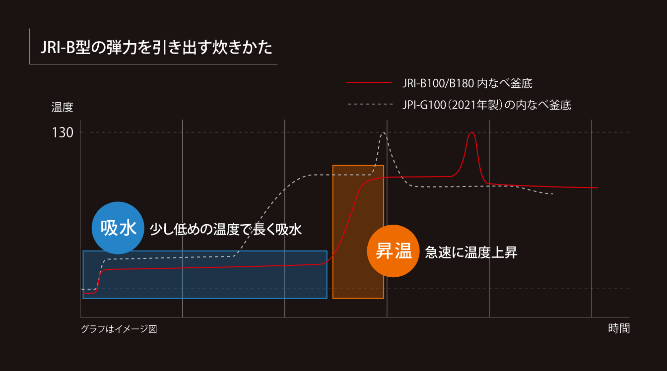 「おいしいごはん」に必要な甘み、弾力、香り、ねばり、やわらかさなど、すべてを引き出す贅沢なメニュー。吸水工程で、通常の「白米」メニューの2倍の時間をかけることで、お米本来の旨みを引き出します。