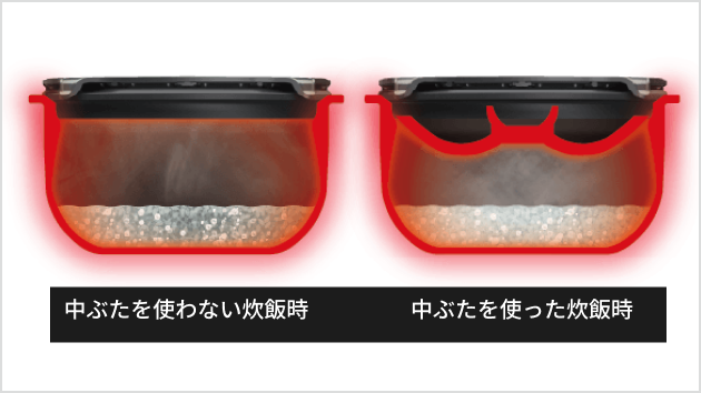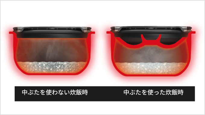 専用の中ぶたを用いることで炊飯空間を1合に最適化し、お米に熱が均等に伝わり大火力で1合を香り高く、