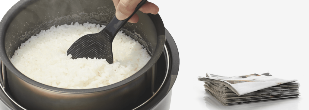 新聞紙1部(3合なら36ページ)さえあればおいしい「炊きたて」ごはんが炊けます。白米は1合から5合、炊込みなら3合まで。