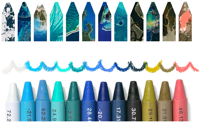 地球の「色」を知り、地球の「色」で遊び、地球をもっと「好き」になってもらうため、宇宙から撮影した地球の色から作られた「海のクレヨン」(スカパーJSAT)