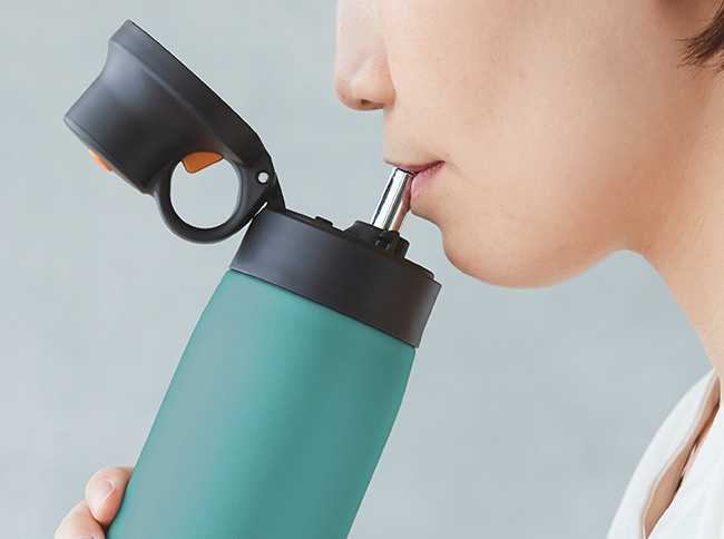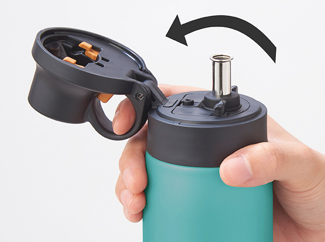 ふたの開閉部は片手で開けやすい設計の「ループせん」を採用。ボタンを押すとロックが解除され、そのままループを指で支えてふたを開ける仕組みになっています。事務仕事中でも、アウトドアのときでもラクに水分補給がおこなえます。
