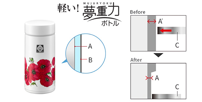 当社独自のスピニング加工により軽量化を実現し、0.35Lサイズは約170gと、軽さが魅力の「夢重カ(むじゅうりょく)ボトル」で、おでかけ時の持ち運びに最適です。