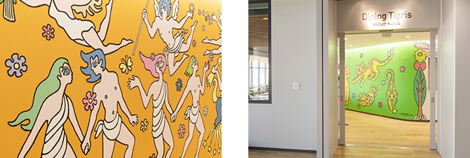 豊かな太陽光があふれる空間。壁画はアパレル大手BEAMS等でデザイナーを務めるミック・イタヤ氏によるもの。細部にわたり社員の休息と憩いの場としての工夫がこらされた社員に人気の食堂です。