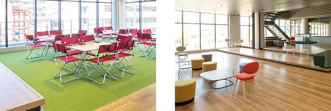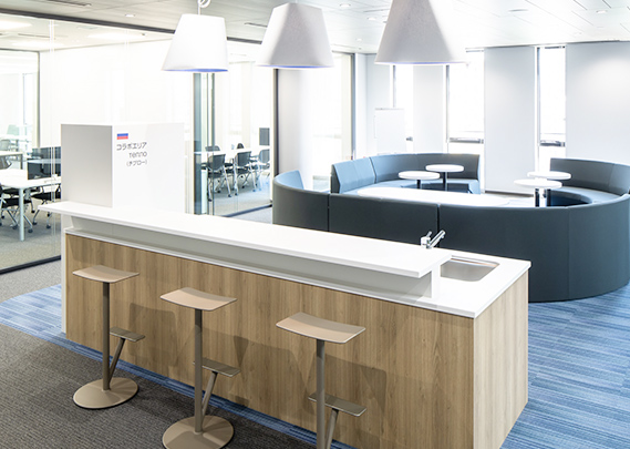 2階〜5階の中央吹き抜け階段横に配置し、南北の執務エリアをつなぐ、明るく居心地の良いラウンジ空間。部署の垣根を越えた自由なコミュニケーションを促します。