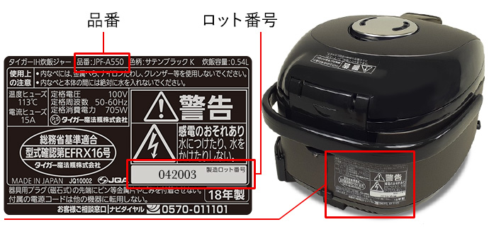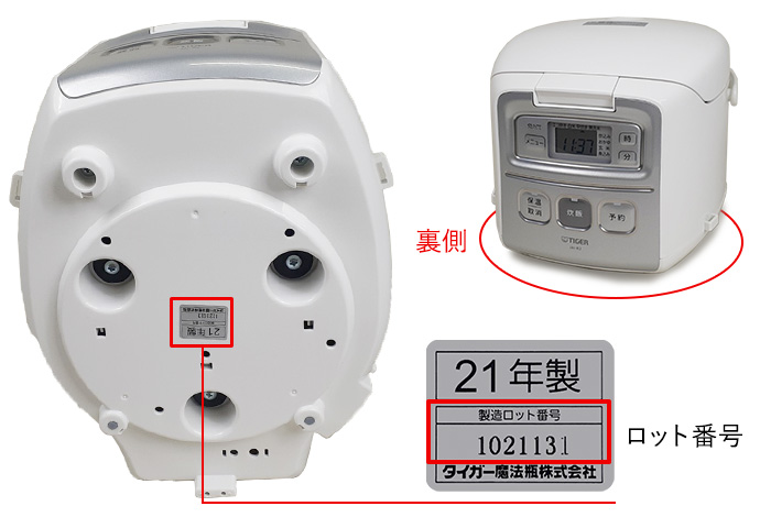 ※製造ロット番号をご確認の際は内容器、内なべが空の状態でご確認ください