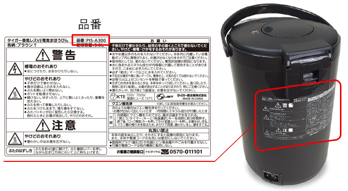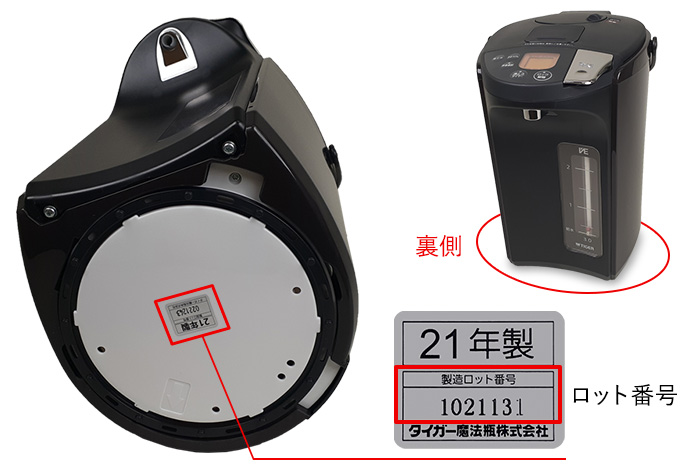 ロット番号は製品底面にある年式シールに印字されています。 ※必ず内容器にお湯が入っていない状態でご確認ください。お湯が入っている状態で、逆さまにするとお湯がこぼれてやけどのおそれがありますので、ご注意ください。