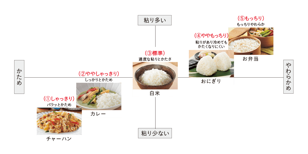 | 銘柄名 | 主要産地 | ごはんの食感基本情報 | 銘柄巧み炊きわけ | ||