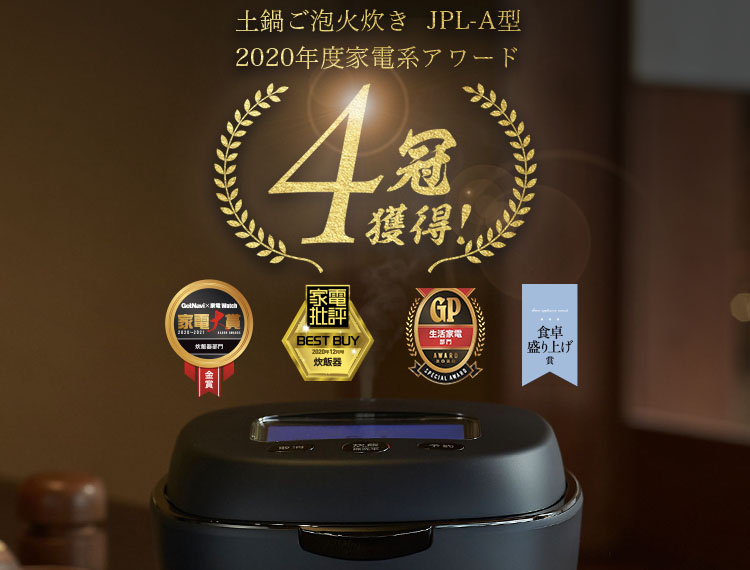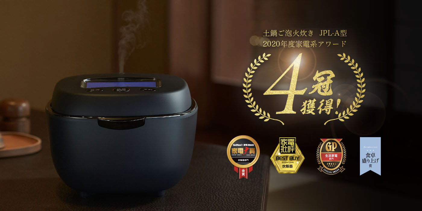JPL型が金賞受賞土鍋ご泡火炊き JPL-A100は、土鍋炊きを極めた機能性とキッチンライフが楽しくなるデザインが注目を集めました。投票いただいた方からは「家で食べるご飯の付加価値が上がった」「1合を美味しくするために、ふたを使うアイデアが良い。物理的な方法に安心感がある。」といった評価をいただきました。
