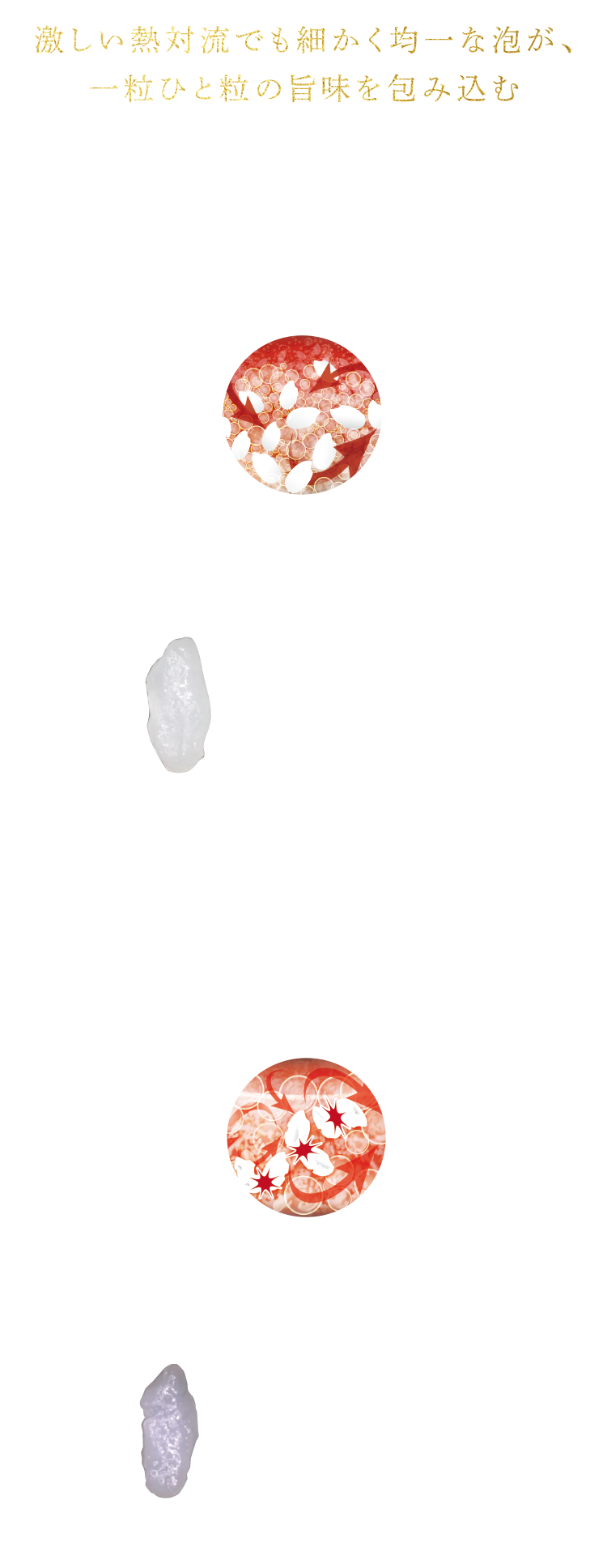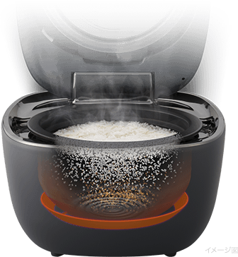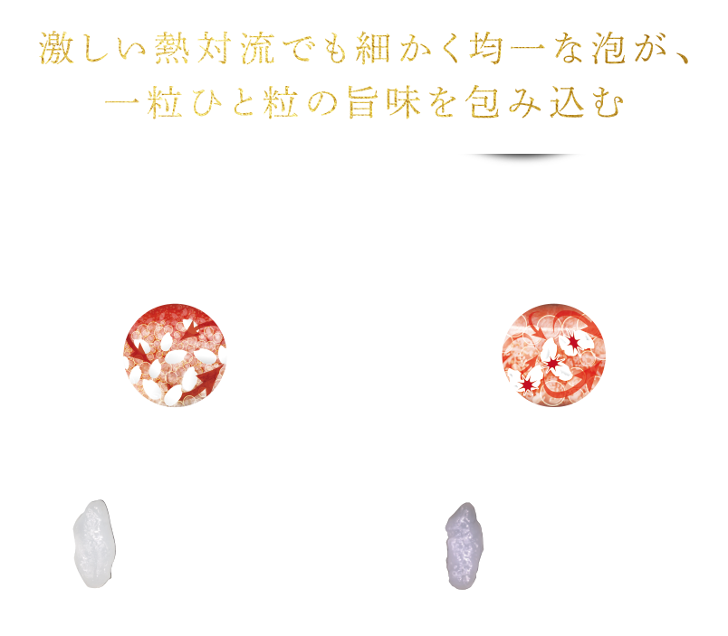 高火力が生み出す細かく均一な「泡」がつつみ込んで、お米を傷つけにくく、旨味を逃さずに炊きあげます。