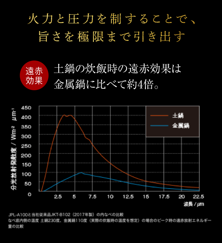 - JPL-A100と当社従来品JKT-B102(2016年製)の内なべの比較。なべ底内側の温度 土鍋230度、金属鍋110度(実際の炊飯時の温度を想定)の場合のピーク時の遠赤放射エネルギー量の比較。JPL-A100 397.6W㎡ μ㎡ JKT-B102 97.7W㎡ μ㎡