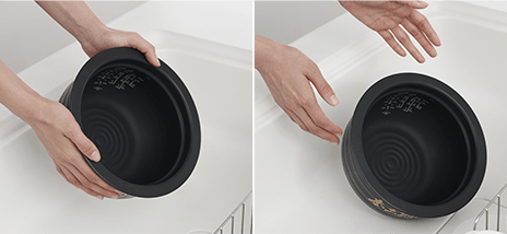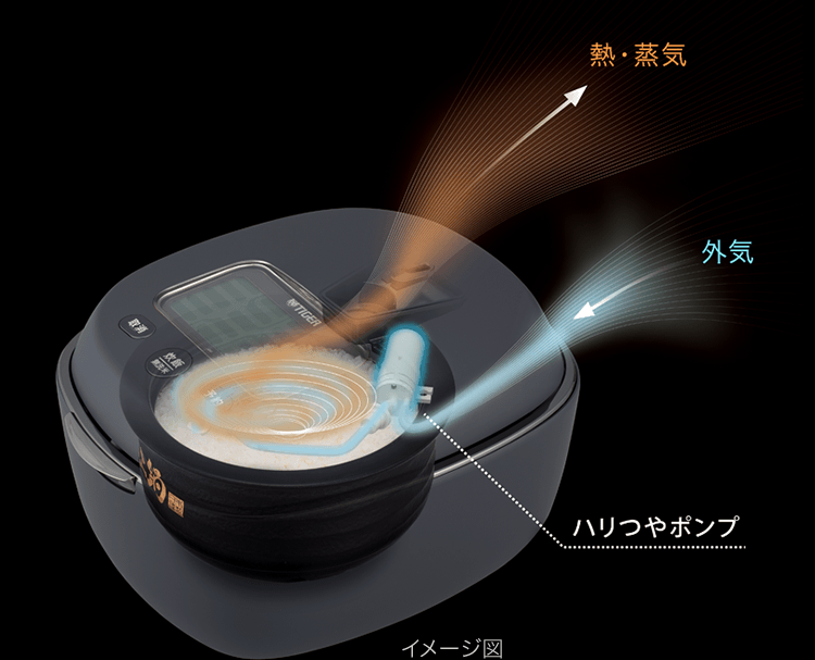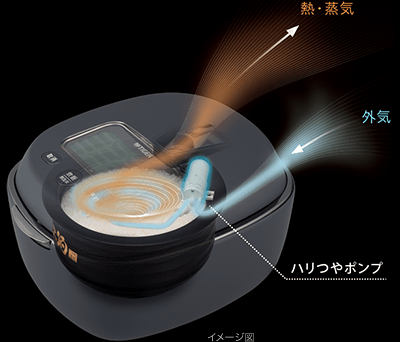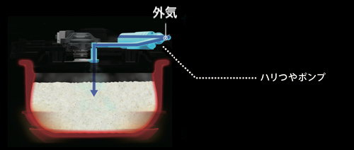 新搭載の「ハリつやポンプ」が稼働して外気を取り込み、高温蒸らし時に発生する過剰な蒸気を放出し、かまどの木製のフタと同様に水分をコントロールしてハリと弾力をごはんから引き出します。