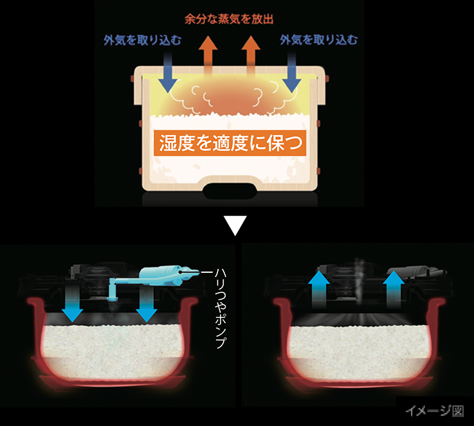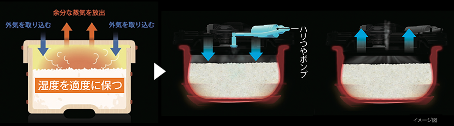 木製のおひつで保温するように「ハリつやポンプ」が外気を取り込み、蒸気を放出。