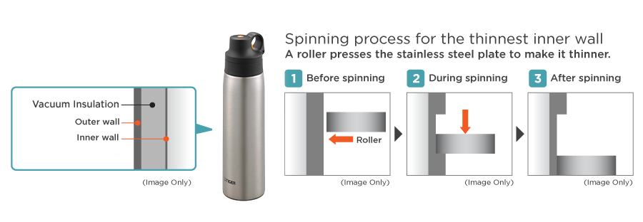 ขึ้นรูปด้วยการกดและรีดแผ่นสแตนเลสให้บางด้วยกระบวนการผลิตเฉพาะตัวของ Tiger จึงทำให้กระบอกน้ำแข็งแรง มีน้ำหนักเบา