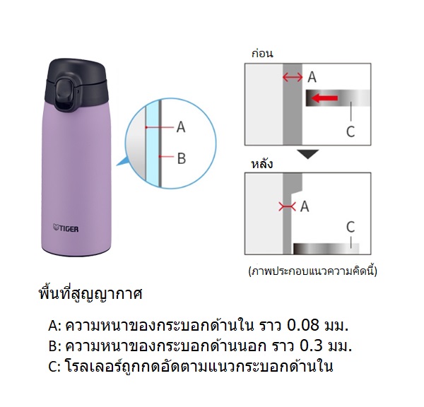 ขึ้นรูปด้วยการกดและรีดแผ่นสแตนเลสให้บางด้วยกระบวนการผลิตเฉพาะตัวของ Tiger จึงทำให้กระบอกน้ำมีน้ำหนักเบา