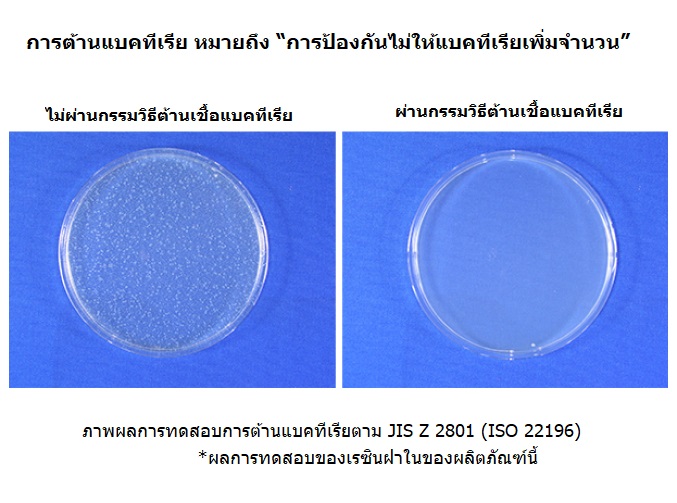 (*1) สัดส่วนของแบคทีเรียบนพื้นผิวของผลิตภัณฑ์ต้องเท่ากับหรือน้อยกว่า 1/100 ของผลิตภัณฑ์ที่ไม่ผ่านการบําบัดและฤทธิ์ต้านจุลชีพจะต้องยังคงอยู่หลังจากการทดสอบความทนทาน คุณสมบัติต้านจุลชีพจะถูกกําหนดจากผลการทดสอบที่ดําเนินการตามมาตรฐานสากล ISO 22196