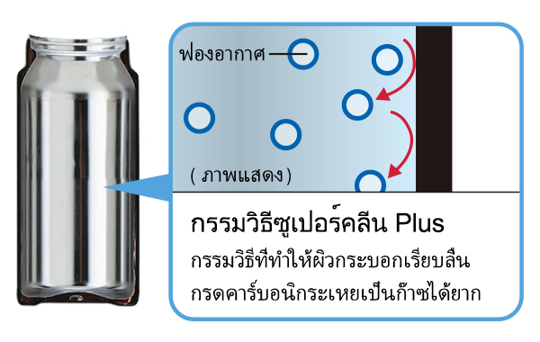 ด้วยกรรมวิธีซูเปอร์คลีน Plus ที่ทำให้ผิวด้านในกระบอกเรียบสม่ำเสมอ จะช่วยยับยั้งการระเหยเป็นก๊าซของกรดคาร์บอนิกได้