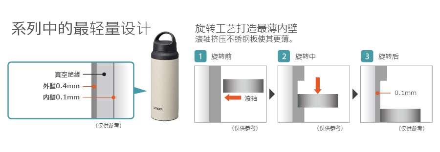 虎牌的真空断热技术可以将饮品长时间的保温、保冷。里面保持温度,而外面摸起来却是不热,并消除了凝结现象。